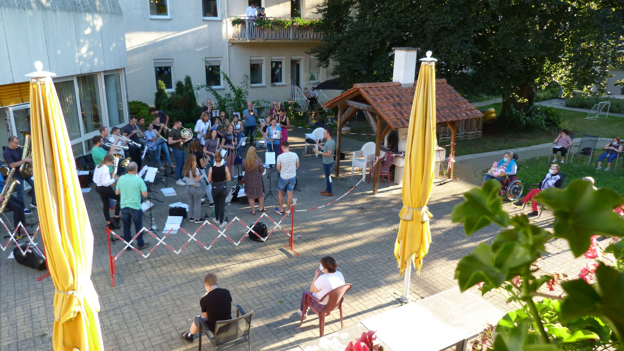 Über das abwechslungsreiche musikalische Mini-Konzert freuten sich am Freitag, den 3.9.2021 rund 50 Bewohnerinnen und Bewohner des St. Paulus Stifts. Bei schönstem Wetter unter freiem Himmel und unter Einhaltung der gängigen Hygiene- und Abstandsregeln wurde geklatscht, getanzt, mitgewippt oder gleich mitgesungen. Die Stimmung war ausgelassen, fröhlich – kurz gesagt: Einfach nur gut. „Wir spielen was gefällt“, lautete das Credo der Kultuskapelle und das taten sie auch. Neben einem Potpourri von Polka bis Swing, gaben die etwa 20 Musikerinnen und Musiker auch Medleys aus 80er Hits oder Dauerbrenner wie Hits von Udo Jürgens zum Besten. Vor allem bei Udo Jürgens Hit „Mit 66 Jahren“ blieb kein Bein mehr still und es wurde mitgesungen was das Zeug hielt. Dirigent Markus Metz nahm alle Zuschauerinnen und Zuschauer mit und sorgte durch seine charismatische mitreißende Art für zusätzliche Stimmung unter den Zuschauerinnen und Zuschauern. Geschäftsbereichsleiterin des St. Paulus Stifts, Frau Natascha Lettner, möchte sich auf diesem Wege nochmal recht herzlich bei allen Beteiligten für dieses kostenlose Konzert bedanken. „Die Musikerinnen und Musiker der Kultuskapelle Hayna haben uns mit dieser musikalischen Unterhaltung eine große Freude gemacht“, meint Lettner.