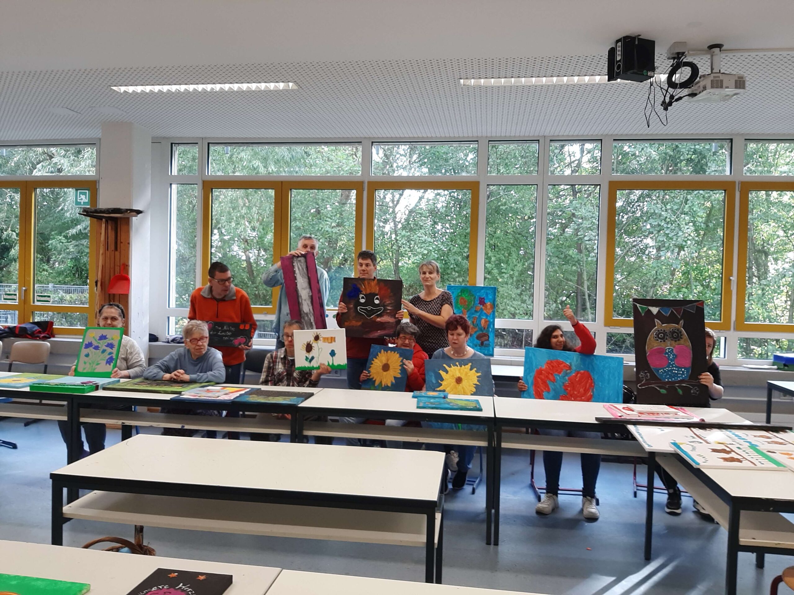 Unter dem Motto „Herbsterwachen“ nahmen drei Bewohner*innen von uns an einem künstlerischen Volkshochschulkurs in Herxheim teil. Dabei sind fantastische kreative Kunstwerke entstanden. Bei diesem inklusiven Kurs hatten die Teilnehmer*innen viel Zeit, um ihre Phantasien zum Thema auf die Leinwände zu bringen. Bemalt wurden die Bilder mit Acrylfarben, als sie trocken waren wurden sie mit Glitzer, Perlen, Gold und Silberfarben verfeinert. Die Kursleitung hatte eine künstlerisch und auch pädagogisch qualifizierte Mitarbeiterin aus unserem Hause inne, die solche Kurse für Menschen mit Beeinträchtigungen bereits seit 2007 anbietet. Zum ersten Mal ging der Kurs einen ganzen Tag lang von 10 bis 17h, so dass noch Zeit für ein leckeres gemeinsames Mittagessen und auch einen schönen Nachmittagskaffee mit hausgemachtem Kuchen blieb. Genau diese wohltuende Zeit ohne Stress und Hektik genossen die angehenden Künstlerinnen und Künstler sehr. So verwundert es nicht, dass auf den nächsten Termin im Frühjahr entgegen gefiebert wird. Oft gibt es eine lange Warteliste. Bereits seit über 20 Jahren arbeitet die Volkshochschule Südliche Weinstraße zusammen mit der BAF zusammen. Die BAF ist eine Initiative von acht Einrichtungen und Diensten der Behindertenhilfe in der Südpfalz. BAF steht für Bildung, Aktionen, Freizeitangebote. Die Initiative wurde 1993 gegründet. Seither gestaltet, plant und koordiniert sie Angebote für und mit Menschen mit Behinderung in der Südpfalz, so dass genau solche inklusiven Malkurse angeboten werden können.