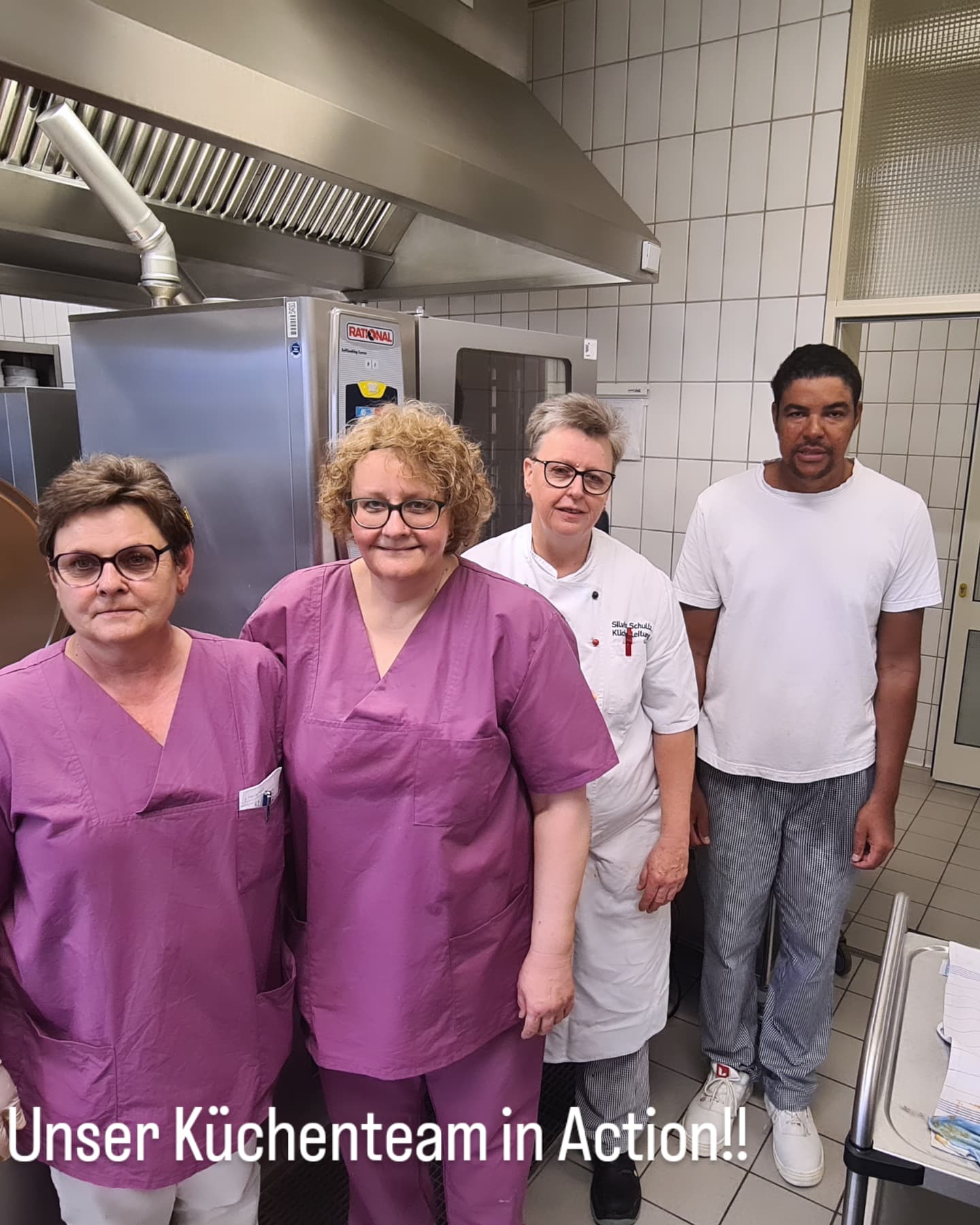 Küchenchefin Silvia erlaubte uns einen Blick hinter die Kulissen. Bei der Zubereitung von allen drei Mahlzeiten Frühstück, Mittagessen und Abendessen für unsere knapp 180 Bewohner*innen hat das Team alle Hände voll zu tun. Alles wird frisch hier im St. Paulus Stift direkt zubereitet und kommt nicht vor portioniert von industriellen Großküchen. Darauf sind wir sehr stolz und legen auch großen Wert darauf. Auf den Servierwägen erhalten die Gruppen alles fix und fertig in Schüsseln und Töpfen und können dann mit den Bewohner*innen gemeinsam essen. Zu Mittagessen gab es an diesem Tag ein typisches pfälzer Essen „Gelleriewe Stampes“ (Karotten Gestampftes) mit Rindergulasch, dazu noch Endiviensalat und ein paar Mandarinchen für die Extra Portion Vitamine. Sogar Kuchen, wird ab und zu (nicht jeden Tag) bei uns selbst gebacken und dann als besonderes Highlight verteilt. Nicht nur kreativ und unglaublich lecker, sondern auch mit viel Herz wird bei uns gekocht. Jeden Tag aufs neue und jeden Tag engagiert und motiviert – herzlichen Dank an unser Küchenteam für deren täglichen Einsatz.