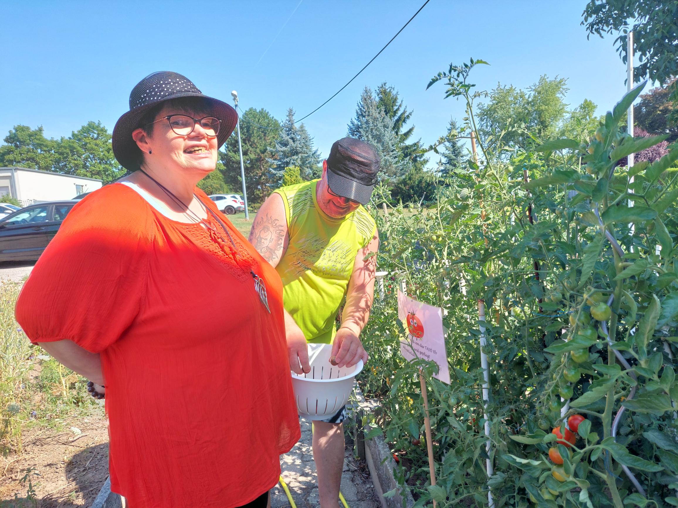 Die Gruppe 8b der Tagesförderstätte hat zusammen mit ihren Besucher*innen ein tolles Projekt ins Leben gerufen. In einem Beet des St. Paulus Stifts stehen zahlreiche schöne große Tomatenpflanzen, die bereits vollhängen mit den unterschiedlichsten Tomatensorten: Romana-Tomaten, Fleischtomaten, Cocktailtomaten, schwarze Tomaten und und und. Alle zwei Tage machen sich Mitarbeiter*innen zusammen mit einer kleinen Gruppe Besucher*innen auf und pflücken das leckere vitaminreiche Gemüse. Danach wird daraus meist ein köstlicher Tomatensalat fürs Mittagsessen zusammen zubereitet. Es gab aber auch schon Tomatensoße, die gemeinsam zubereitet wurde, je nachdem auf was alle gerade Lust haben. Die Besucher*innen wurden von Anfang an in das Projekt „Selbstversorger-Beet“ einbezogen und so musste frische Erde gekauft, der Boden gelockert, und dank der Hilfe unseres Gärtners Sepp, der die Tomatenpflanzen in unserem Gewächshaus hochzog, die Setzlinge dann auch eingepflanzt werden. Jetzt ist die schönste Zeit – die Erntezeit – doch alle zwei Tage gießen gehört natürlich auch noch dazu. Alle helfen hier gerne mit, denn gemeinsam etwas zu schaffen und dann die „Früchte der Arbeit zu ernten“ ist doppelt schön und doppelt lecker. Kein Wunder also, dass jetzt schon überlegt wird, was nächstes Jahr im Beet angepflanzt werden könnte: Vielleicht Melonen oder Zucchini? Wir lassen uns überraschen.
