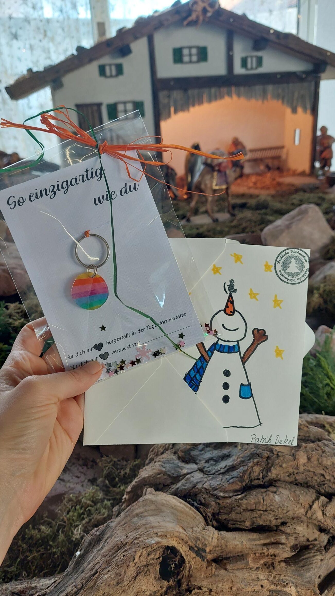 Ganz besondere Geschenke machten in diesem Jahr die Bewohnerinnen und Bewohner den Mitarbeitenden. Ja, richtig gehört die Bewohner*innen beschenkten die Mitarbeiter*innen und nicht umgekehrt. Dank der wunderbaren Idee einer Mitarbeiterin der Tagesförderstätte wurden 300 Schlüsselanhänger jeweils mit einem individuell gemalten Bild sowie eine ebenfalls selbst bemalte Karte an die gut 300 Beschäftigten verteilt.
