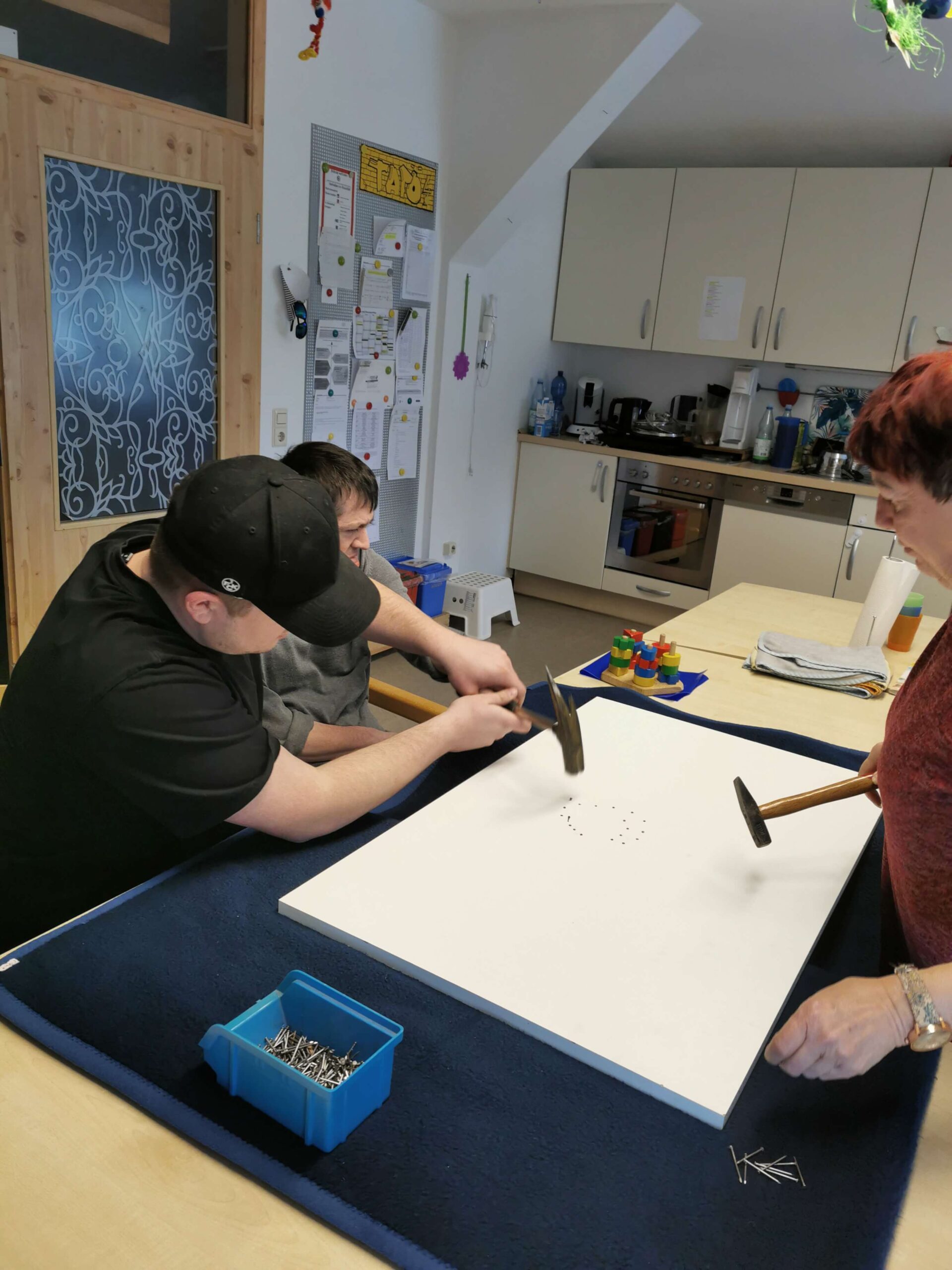 Bis am Freitag, den 12.5.2023 an den sieben geplanten Aktionsständen die Post abgehen kann, wird derzeit in den Gruppen der Tagesförderstätte schon allerhand für das Sport- und Spielfest vorbereitet. Denn für die geplanten „Disziplinen“ Kegeln, Dosenwerfen, Turmbau, Schwammlauf, Weitwurf und Wasserbomben werfen werden natürlich auch entsprechende Utensilien benötigt. In der Tagesförderstätte 4 wird aktuell ein Nagelbrett für die Station „Wasserbomben“ zusammen mit den Bewohnern gebaut. Und so funktioniert’s am Sport- und Spielfest: Jede Wohngruppe darf zusammen mit den Mitarbeiter*innen ihr/sein Glück an den Aktionsständen versuchen. Die Besucher*innen erhalten an jedem Stand Punkte, welche auf einer Laufkarte eingetragen werden. Wer am Ende die meisten Punkte hat erhält einen Wanderpokal und, dass niemand leer ausgeht, gibt es für alle eine Teilnahmeurkunde. Die Siegerehrung der Top-Platzierten findet im Innenhof statt. Daneben läuft noch ein besonderer Wettbewerb: Derjenige mit dem besten Outfit wird mit einem Pokal prämiert. Neben Sport und Spaß ist für die Verpflegung bestens gesorgt. Die Vorfreude zum diesjährigen Sport- und Spielfest steigt also im St. Paulus Stift.