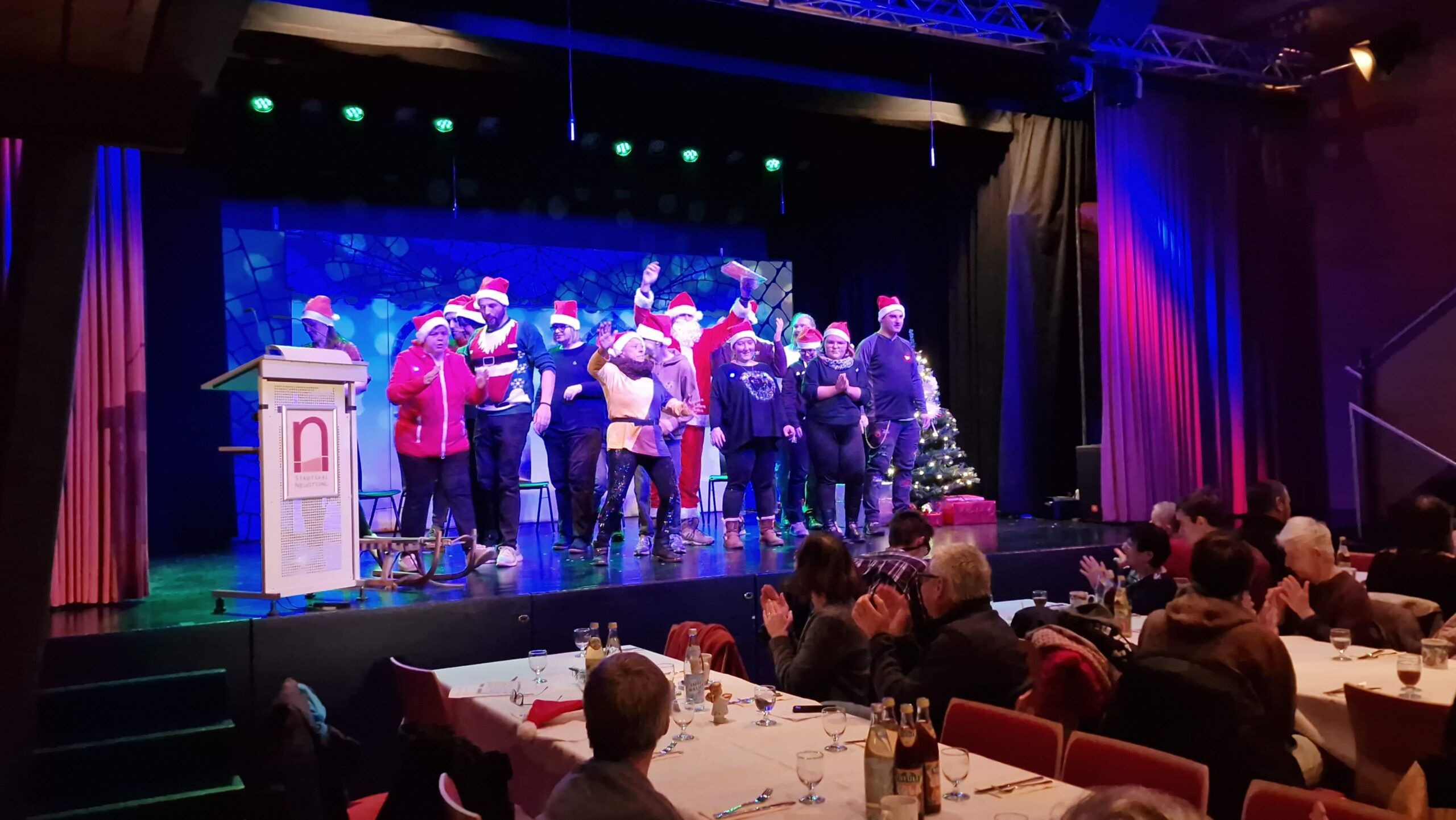 Alle Jahre wieder? Nein nicht ganz, wegen der Corona-Pandemie hat es genau 1093 Tage gedauert, bis es wieder ein großes Weihnachtsfest für die Wohngemeinschaften des St. Paulus Stifts gab. Festlich schön im Neuöttinger Stadtsaal mit gutem Essen, Unterhaltung (in Form eines eigens einstudierten Theaterstücks) und rund 200 Gästen – eben so wie es sich für eine richtige Weihnachtsfeier gehört. Auch Petrus sorgt am Freitag, den 9.12 durch den einsetzenden Schneefall für weihnachtliche Stimmung.