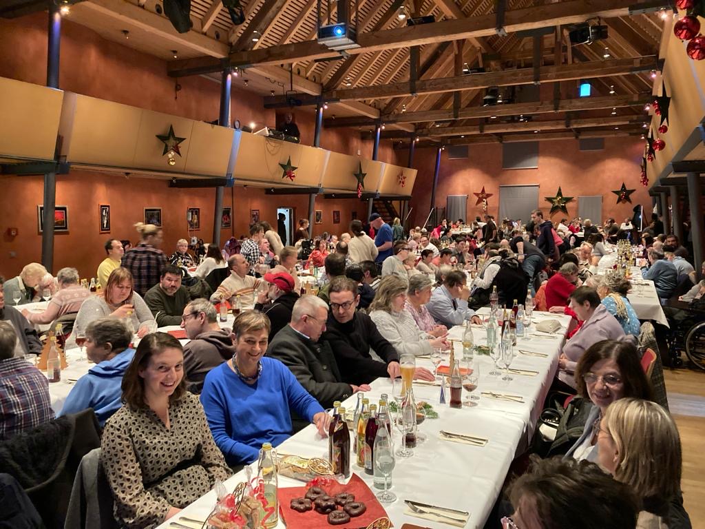 Bevor nun die Sternezeltküche mit ihren Leckereien die Gäste verwöhnen durfte, kam Pfarrer Schauer noch auf die Bühne, um mit einer kleinen liturgischen Betrachtung und einem gemeinsam gesungen Lied den offiziellen Teil dieser Weihnachtsfeier zu schließen.